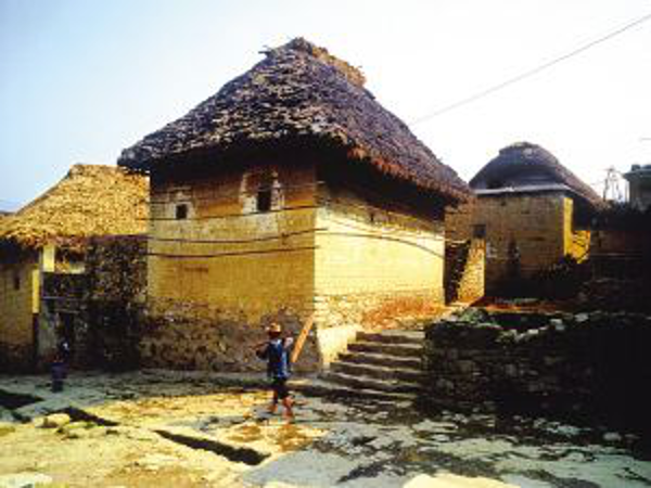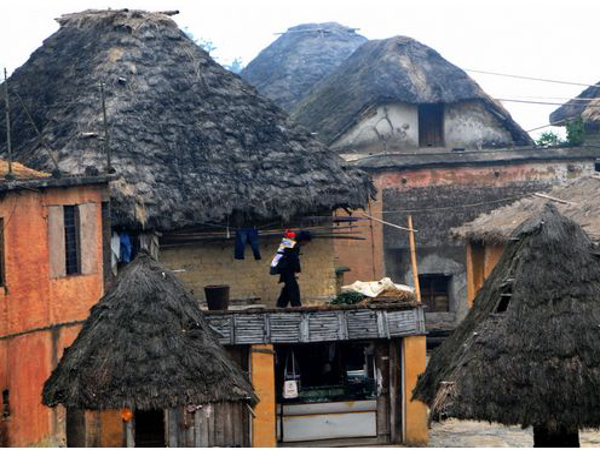 蘑菇房,顧名思義,它狀如蘑菇。房子的墻基用石料或磚塊砌成,地上地下各有半米,在其上用夾板將土舂實一段段上移壘成墻,最后屋頂用多重茅草遮蓋成四斜面。