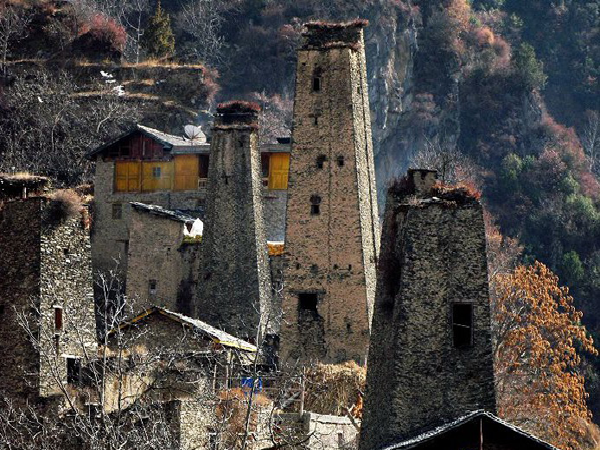 在羌語中,碉樓被稱為“邛籠”,意為美麗、高貴的房子,早在2000年前《后漢書·西南夷傳》就有羌族人“依山居止,壘石為屋,高者至十余丈”的記載。碉樓的高度在十米至三十米之間,用于御敵、貯存糧食和柴草。碉樓有四角、六角、八角幾形式,有的高達(dá)十三四層。建筑材料是石片和黃泥土,墻基深1.35米,以石片砌成。石墻內(nèi)側(cè)與地面垂直,外側(cè)由下而上向內(nèi)稍傾斜。修建時(shí)不繪圖、吊線、柱架支撐,全憑高超的技藝與經(jīng)驗(yàn)。建筑穩(wěn)固牢靠,經(jīng)久不衰。自唐朝來,羌族人民因各種原因向西北遷移,到了西藏和青海,所以現(xiàn)在,羌族碉樓也往往被稱為藏族碉樓。