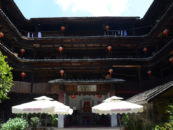 一座土樓就是一個(gè)藝術(shù)殿堂。每一座土樓,又如同一個(gè)“大家族,小社會(huì)”。土樓內(nèi),居住在同一屋頂下的幾十戶幾百人同祖同宗同血緣同家族,過著共門戶、共廳堂、共樓梯、共庭院、共水井的和睦生活。這種聚族同樓而居的生活模式,典型地反映了客家人的傳統(tǒng)家族倫理和家族的親和力。而且,樓內(nèi)的客家人,住著層數(shù)相同、開間面積相等、無明顯朝向差別、更無貴賤等級之分的均等居室。平等聚居,反映了客家人融洽和睦的家風(fēng)和平等團(tuán)結(jié)的傳統(tǒng)。
