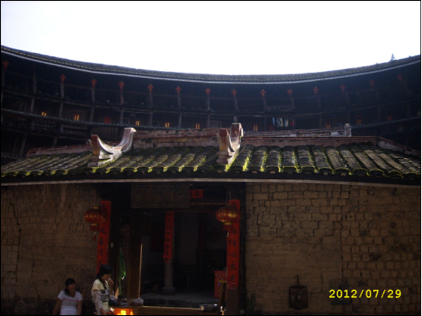 土樓和長城差不多,是用糯米、石灰、蛋清和泥土混合而成的外墻,內(nèi)部是用黃木和杉木,夏可抵暑氣,冬可抵冽風(fēng),還可自動(dòng)調(diào)節(jié)室內(nèi)的溫度。