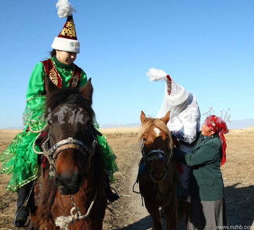 新娘唱完“闊爾斯”后,在伴娘的攙扶下,和親人們一一擁抱,揮淚告別。新娘離家時,彩巾蒙頭,出門吻別父母,騎上最快最好的馬,同新郎并駕而行。遇有攔路的繩索,新娘必須下馬,向攔路的小伙子贈送紀(jì)念品,否則,小伙子們會故意取鬧不放行。