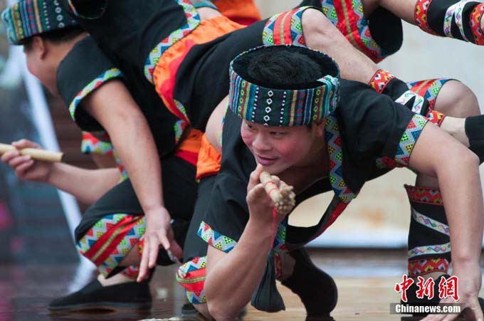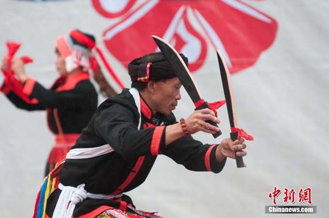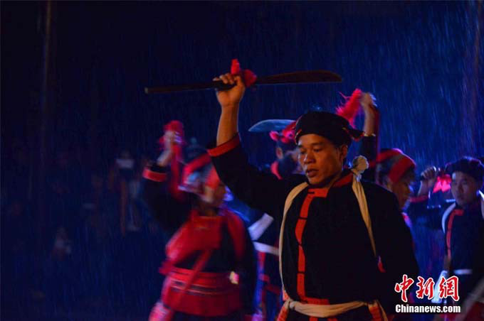 12月6日,在中國瑤族之鄉(xiāng)廣西金秀瑤族自治縣的盤王節(jié)上,當地瑤族百姓在跳”刀舞”