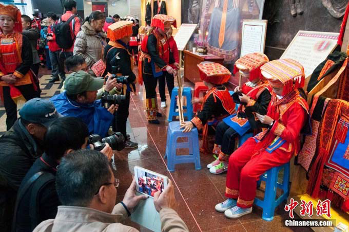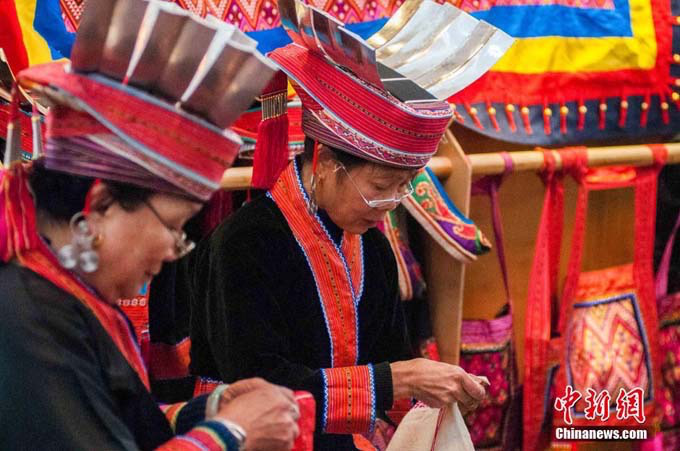 12月6日,在中國瑤族之鄉(xiāng)廣西金秀瑤族自治縣的盤王節(jié)上,當地瑤族百姓展示瑤族織繡