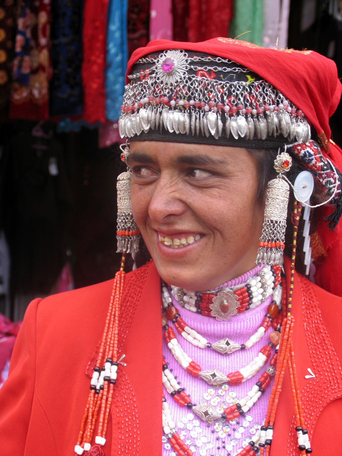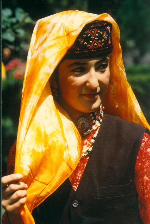 塔吉克族婦女服飾的顏色艷麗而奪目,大多數(shù)會以紅色為主,她們喜歡穿連衣裙,并在裙邊、領(lǐng)口、袖口上繡以美麗的花紋或者圖案,還喜歡用耳環(huán)、項鏈、手鐲等首飾來裝扮自己。她們十分講究頭飾和帽子,有一種青年婦女的圓形花帽上會嵌鑲金、銀片和各種珠子,帽子前沿會裝飾一排色彩鮮麗的珠子、銀鏈。婦女著裝時帽沿上會加綴一排小銀鏈,在塔吉克語中稱為“斯拉斯拉”,戴著大耳環(huán),脖子山會繞數(shù)道項鏈,胸前還會佩戴被稱為“阿勒卡”的圓形大頭飾。通常情況下,已婚婦女會在發(fā)辮上綴飾白紐扣,新娘也會在發(fā)辮上飾以絲穗,以求美觀。在塔什庫爾干,打扮得花枝招展的塔吉克婦女隨處可見,猶如從天上云彩中下凡的仙女。塔吉克族已婚婦女的裝束也十分吸人眼球,她們外出時,會在帽子外披上頭巾,迎風(fēng)走來,頭巾隨風(fēng)飄揚,別有一番風(fēng)度。