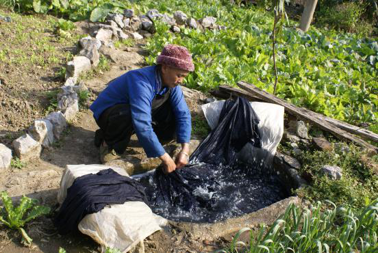 從前壯族鄉(xiāng)村,普遍掌握制作藍(lán)靛及印染方法。一般置一大缸,將藍(lán)草放入浸泡,加石灰使之分解、發(fā)酵,經(jīng)過(guò)化學(xué)變化,而后濾去殘?jiān)?,蒸發(fā)水分,凝成糊狀藍(lán)色染料。其間需不斷攪動(dòng),使色素充分化解?!懊康宀萘俳?,造成一百斤之靛為佳?!币虍a(chǎn)量較多,遠(yuǎn)銷廣東。浸染時(shí),將適量靛糊化于染缸中,同時(shí)將雞血藤搗碎加入。布要反復(fù)浸泡多次,晾泡結(jié)合,直到染為深藍(lán)色。其間雞血藤釋放出一種紫紅色的植物膠,將藍(lán)靛色素粘在纖維上,是色素耐水耐腐耐紫外線,不易褪色,并有若隱若現(xiàn)的亮點(diǎn),結(jié)實(shí)美觀。這個(gè)過(guò)程,運(yùn)用了化學(xué)分解法。