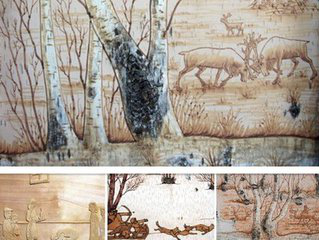 樺樹(shù)皮畫(huà)是樺樹(shù)皮工藝品中重要一種,它從簡(jiǎn)單適用的生活必需品中脫穎而出,成為滿族鄂倫春、鄂溫克、達(dá)斡爾、赫哲等北方狩獵民族精神文化特殊需求的用品。樺樹(shù)皮畫(huà)是用樺樹(shù)皮為繪畫(huà)材料,運(yùn)用樺樹(shù)皮天然形成的紋理、樹(shù)節(jié)為繪畫(huà)元素,利用獨(dú)特的繪畫(huà)工藝和技術(shù)繪制的以反映游獵民族社會(huì)生活為內(nèi)容,體現(xiàn)游獵民族思鄉(xiāng)情懷的工藝美術(shù)品。樺樹(shù)皮畫(huà)主要使用揭皮手法和碳化工藝來(lái)進(jìn)行創(chuàng)作,崇尚自然和環(huán)保理念。自然古樸、不可復(fù)制、裝飾性強(qiáng)和游獵民族的民族特性,是樺樹(shù)皮畫(huà)的幾個(gè)突出特點(diǎn)。