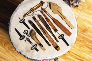 安宇歌介紹,口弦都是純手工制作的,最難制作的部分是能發(fā)音的中簧。制作中簧時(shí),選取原料須是圓形鋼絲,先要將其砸扁,兩邊是尖的,整個(gè)簧的距離由寬到窄,窄的部位向上折彎成鉤,留兩公分長(zhǎng)度,再折一小鉤。并且,中簧需高溫淬火,這是一個(gè)難度極高的環(huán)節(jié),全憑手感。如簧不淬火便會(huì)彈性不好,淬過(guò)了頭則一彈就碎,淬不到位會(huì)導(dǎo)致彈撥口弦時(shí)所發(fā)的聲音不佳。從某種程度上講,用口弦彈奏的音樂(lè)之所以引人側(cè)耳,關(guān)鍵就在這根中簧上。