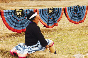 白褲瑤女人體態(tài)婀娜。這婀娜既來自于她們風擺楊柳般的百褶裙,也來自身上前后兩片的夏衣。夏衣,黑色的調子,沒領,沒袖,前面是一塊和肩膀寬度相等的正方形素布,后面則是用蠶絲布來制作的裙邊土布,上面繪滿了蠟染和花繡圖案。用漿染土布縫制成的百褶裙上,布滿了手繪而成的彩色圖案。其最復雜的工序,一是借粘膏樹汁憑空勾畫,二是用花線依著粘膏樹汁描過的隱約印痕,一點一點地挑繡出彩色圖紋來。做好一條裙子,往往需要花上女人們半年的時間。