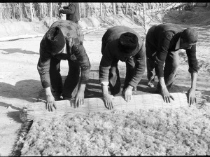 這時(shí),亞生已經(jīng)開(kāi)始了第二步,他把彈好的羊毛鋪勻,開(kāi)始噴灑開(kāi)水。只見(jiàn)他熟練地把水噴向羊毛,然后和妻子一起快速把簾子卷好,用羊毛繩綁緊,再用腳踏著卷好的簾子在平地上來(lái)回踏蹬,這樣不停地重復(fù)后,做成了氈坯。亞生停下來(lái)解開(kāi)簾子,拉平氈坯,修整好邊角,又灑上熱開(kāi)水,把氈坯卷起,這是工藝最關(guān)鍵也是最后一步——他們一起跪在簾上,用雙臂反復(fù)搓滾氈坯,感覺(jué)已經(jīng)平整了,夫婦倆又齊心協(xié)力把氈坯展開(kāi)拉平,放到院子里。此時(shí),亞生長(zhǎng)出了一口氣,抹抹頭上的汗說(shuō):“晾干了就可以賣(mài)了!”