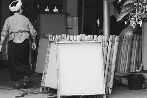 澆紙是在紙槽中進(jìn)行的,不但需要強(qiáng)勁的臂力,還需要相當(dāng)?shù)募?xì)心。在紙槽中舀水的時候,雙臂承受的重量不下10公斤,紙要澆得恰到好處,澆輕了紙就太薄,澆重了紙又太厚。太薄出不了好品相,太厚會增加成本。這是整個構(gòu)紙成品的關(guān)鍵,經(jīng)驗老到的傣族老人,都不會在這道工序上馬虎。一雙手游走在澆紙槽,或輕輕拍打,或慢慢游弋,絮狀的纖維時而附著在手上,時而又歡呼雀躍地散開,頑皮得有點(diǎn)像芒團(tuán)村水塘邊遇上的那些孩子。憑感覺均勻了,老人這才輕輕將澆紙盤脫離水面,一眨眼功夫,一張構(gòu)紙便在盤上現(xiàn)出端倪。接下來的事就交給陽光了,如果雨季來臨,構(gòu)紙就停止生產(chǎn)。所以說,芒團(tuán)構(gòu)紙常常浸漬著一種陽光的味道。
