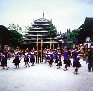 侗寨鼓樓前的表演。侗家把鼓樓當做遮蔭樹,既是侗寨的象征,也是氏族的標志。因此,所有鼓樓都是全寨人集資、出力興建的,大一點的村寨按居住范圍會建幾座鼓樓。