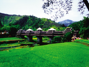 程陽永濟橋始建于民國初年,集橋、亭、閣、樓、臺于一身。橋墩石塊砌成六面柱體,墩上設兩層原木托架梁,托架上建有5座塔閣式橋亭和19間橋廊。橋廊為木結構,上覆琉璃泥瓦,對稱分布,中間為六角攢頭重檐亭。整座橋和諧得體,如游龍翹首,鳳凰展翅。它與我國的趙州石拱橋、瀘定鐵索橋、羅馬尼亞鋼梁諾瓦沃橋并稱為世界四大歷史名橋。