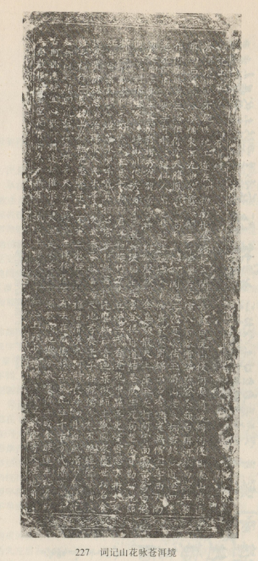 白文碑刻。明楊黼作。景泰元年(1450年)立,原嵌于大理縣作邑鄉(xiāng)慶洞莊圣元寺偏殿前廳北壁,后移至大理縣文化館。碑文14行,陰文正體,從右到左直行書寫。首行為題,其余正文,共13行,每行40字,只第9行41字,末行39字。全詩20節(jié),每兩節(jié)為一聯(lián),共10聯(lián)。前4聯(lián)詠蒼山洱海的自然景色和地勢名勝,后6聯(lián)抒作者之情感。以白語吟誦,優(yōu)美動聽。這是目前保存最為完好的一塊白文碑。傅懋勣、肖雷南在40年代曾根據(jù)郭純仁的讀音注解此碑,有油印本。石鐘健、楊燦然、徐嘉瑞亦對此碑加以研究。1957年,徐琳、趙衍蓀以郭純仁讀音為本,用國際音標記音,并加翻譯?!睹褡逭Z文》1 980年第3期載有釋讀文章。