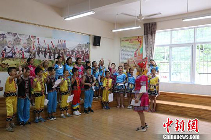 廣西“山歌王”陸連芳給孩子們上課( 林馨 攝影)