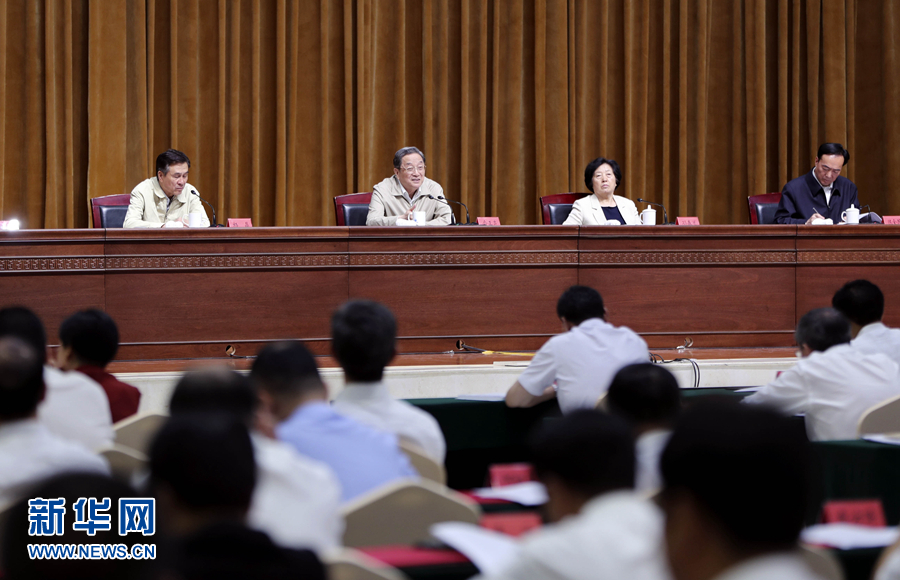 圖為7月10日,俞正聲出席第六次全國對口支援新疆工作會議第一次全體會議(新華社)