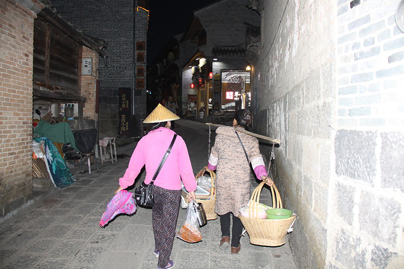晚上7點(diǎn)多鐘,一群在小河里撲騰了一天的鴨子排著隊(duì)憨態(tài)可掬地回到寸家灣巷口,忙碌一天的人們也開始回家。我正擔(dān)心晚上約定的采訪找不到地方,卻在圖書館旁邊的小巷里碰到了收工回家的姜聰留。她今天的松花糕賣了一板半,收入100多元。同行的一個(gè)姐妹幫她挑著擔(dān)子,姜聰留自己提著袋子和板凳,一路無語。臨近家門的路口,姜聰留從姐妹肩上接過擔(dān)子,眼神默契相視后,各自回家——這就是她們的生活。晚飯姜聰留到丈夫的大哥家吃土鍋?zhàn)?,兩家的院子只隔一墻,我也跟著進(jìn)了大哥江宗良的家門。