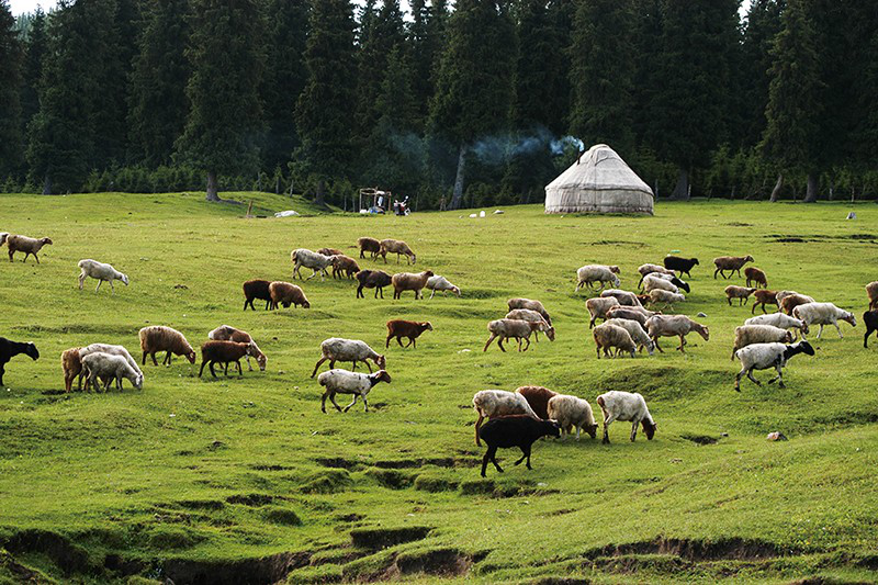 到了牧場,人們選有水有草的地方扎下帳篷。水與草是先祖?zhèn)冊诙嗄昵斑x擇生存地時的必要條件。水,可以供人畜飲用;草,可以供牛羊啃食。這時候,牧民們各自選一個地方將牛羊分開,讓它們在山野里去吃草。今年的草已經(jīng)全部長出,牛羊們開始了又一次盛宴。
