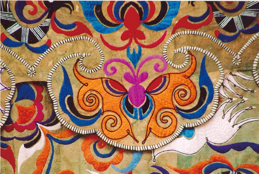 在苗族各種工藝的服飾圖案中,蝴蝶是俯拾皆是的,而丹寨縣雅灰鄉(xiāng)和榕江縣高排鄉(xiāng)等地的苗族百鳥衣上,大面積地使用絲帛和絲線刺繡,常在中心位置繡著一種奇特造型的動(dòng)物圖案,頭是變形的鳥頭,身是蟲身,有節(jié),周圍是飛舞的蝴蝶。不少人解釋它為龍。其實(shí)那是蠶蟲、鳥、蝴蝶的結(jié)合:蝴蝶——鳥——蠶蟲——一幅圖本身就包含了蝴蝶圖騰的全部寓意。