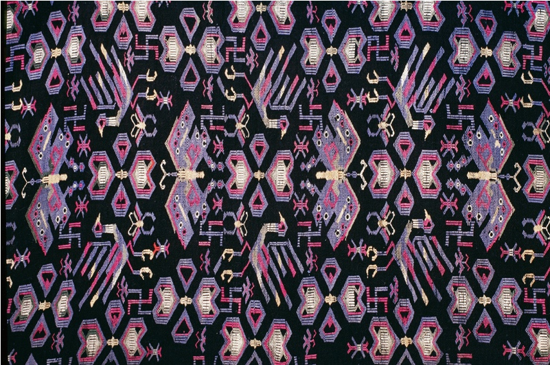 亳無疑問,蝴蝶圖騰即是對(duì)蠶的崇拜,蠶文化原初的核心便是人歸途的儀式,人要在這種和蠶一祥的儀式中得到再生。今天的苗族,仍然保持著以絲綢裹身而葬的喪葬習(xí)俗。我祖母養(yǎng)蠶織就的絲織品,我們習(xí)慣稱作蠶絲床單,絕大部分是備著喪葬所用。凡有人去世,主客必送一床蠶絲單,沒有是不行的,被視為不懂禮節(jié),而死者獲得蠶絲單越多越好。有的人家收到的蠶絲單過多,就會(huì)保存一部分,留著將來的喪事送禮。苗族每個(gè)人都必備一件絲質(zhì)壽衣。并且,在許多重大的儀式活動(dòng)中必須要著絲綢服裝。比如在苗族重大的鼓藏節(jié)期間,鼓社頭必須穿絲織鼓社服;大祭典活動(dòng)時(shí),祭師也必須穿絲質(zhì)服裝等等。