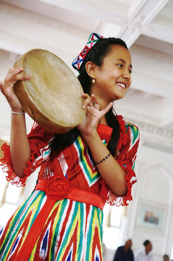 11歲的麥迪娜是小學(xué)五年級(jí)的副班長(zhǎng),在麥蓋提一小雙語班讀書,漢語好到可以給我做翻譯,向老藝人提問。麥迪娜的世界已經(jīng)和老藝人、和叢林中艱難漁獵的祖先不一樣了。她在麥西來甫中敲達(dá)甫手鼓,在活動(dòng)中心學(xué)習(xí)電子琴,是女子“手鼓樂隊(duì)組合”中8位11—3歲女孩子中的一個(gè)。她希望將來能在北京上學(xué)、成為醫(yī)生治好奶奶的糖尿病。她會(huì)用漢語唱國(guó)歌和《歌聲與微笑》,還有《茉莉花》,雖然吐字與調(diào)子不太那么準(zhǔn)。她圍著阿布都克萊姆(被稱作“維吾爾人的趙本山”的維吾爾族諧星)索要簽名的同時(shí),還喜歡羅志祥,以韓國(guó)偶像組合EXO為榜樣。麥迪娜還上過電視,常有喀什地區(qū)的、自治區(qū)的、全國(guó)的媒體到麥蓋提來采訪、錄制刀郎麥西來甫。