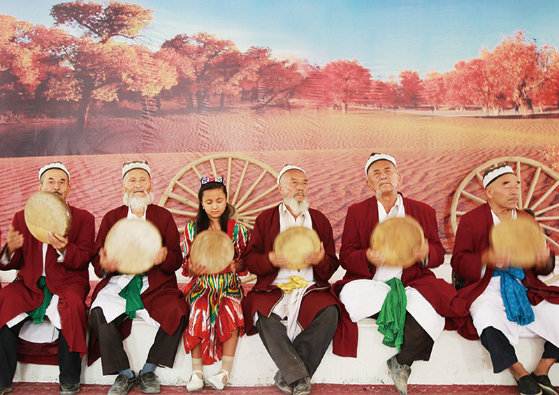 從麥迪娜9歲起教她達(dá)甫手鼓的是母親,把她打扮得漂漂亮亮的、去趕一場(chǎng)又一場(chǎng)麥西來甫的也是母親。作為央塔克鄉(xiāng)文化站站長(zhǎng),麥迪娜的母親整年都忙碌得要死。麥蓋提縣央塔克鄉(xiāng)以刀郎舞、農(nóng)民畫立鄉(xiāng),觀光者多,活動(dòng)多,任務(wù)多,接待多。它不僅是旅游之地,也是生活之地。麥迪娜的母親是位典型的維吾爾族女性,眉眼如刻,目光流轉(zhuǎn),婚后迅速發(fā)胖。在一大群女人當(dāng)中,她一定是最搶眼、最熱烈、最能干的那個(gè)。無論哪家舉行麥西來甫,都會(huì)邀請(qǐng)她。她總是提前到來,手腳麻利地幫忙,氣度昂揚(yáng)地端桌布菜,熱情洋溢地放歌起舞。有時(shí),母親也會(huì)提前帶麥迪娜到舉辦麥西來甫的家庭中,麥迪娜就會(huì)學(xué)母親的樣子,進(jìn)廚房幫忙干活,直到麥西來甫開始,才換上衣裙,擠身樂師中間。麥迪娜沒有時(shí)間像其他孩子那樣,在鄉(xiāng)野、麥西來甫上盡情嬉戲,正如她的母親,只能將女兒的日常生活托付給奶奶照顧。