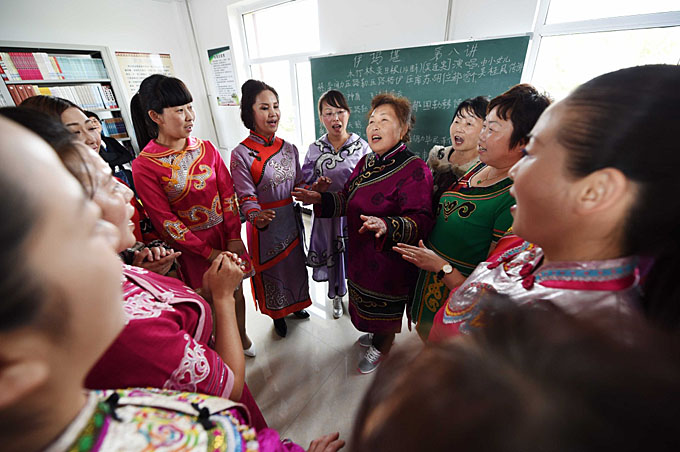 “伊瑪堪”傳承人吳桂鳳(右四)在同江市八岔赫哲族“伊瑪堪”傳習(xí)所教授“伊瑪堪”(新華社記者王建威  攝影)