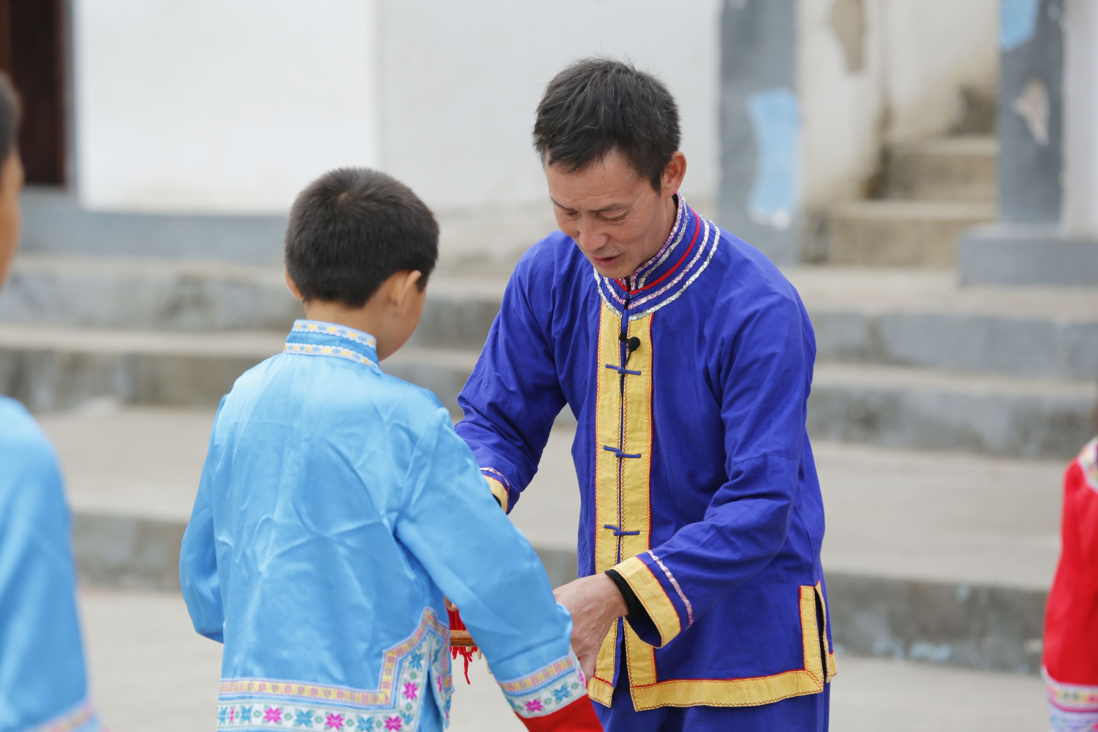 圖片名稱:貴州貴陽苗族長竹舞傳承人教孩子們持竿手法