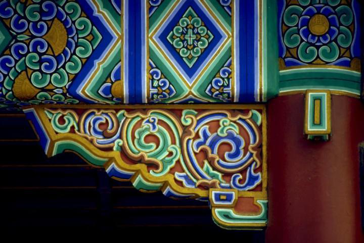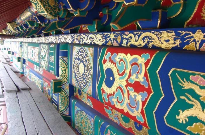 彩畫著色是一項關(guān)鍵的工序,不能有半點差錯。工匠們?yōu)椴煌伾O(shè)定了代號,一米色、二淡青、三香色、四硝紅、五粉紫、六洋綠、七佛青、八石黃、九紫色、十黑煙、十一紅等。將代號直接寫在地仗上,然后根據(jù)色號將各種色料對號入座,涂刷著色一、二遍,待干后再刷一遍光油罩光,以起保護(hù)作用。彩畫所用色料一般均為各色成品油漆。