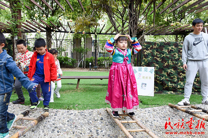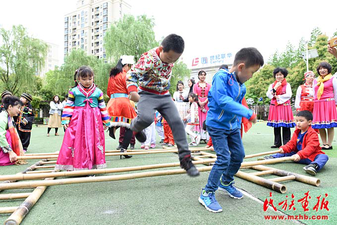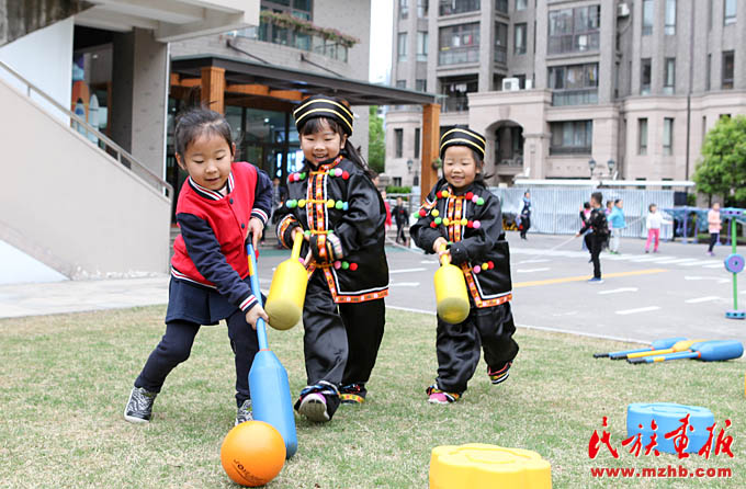 畬族的“摘柿子”、維吾爾族的“賽馬”、黎族的“跳竹竿”、蒙古族的“射箭”……天恒名都幼兒園的操場上,孩子們正積極參加各種民族游戲活動,沉浸在無憂無慮的快樂中。4月13日,是上海市莘莊工業(yè)園區(qū)天恒名都幼兒園的“民族接力棒小社團”活動日,孩子們非常期盼這每周一次的活動日。