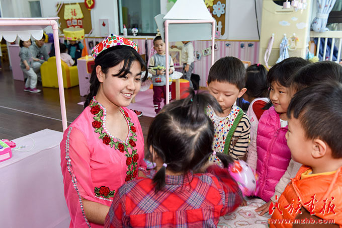 自2014年首場“民族風(fēng)吹進幼兒園,愛心曲唱暖身邊人”公益活動獲得積極反響后,幼兒園黨支部、工會、團支部牽手園區(qū)民族團結(jié)共建單位,走出校園、貼近社區(qū),以愛心義賣、義拍、定向捐助等方式為園區(qū)少數(shù)民族困難家庭送去關(guān)懷。在近幾年的園區(qū)民族工作實踐中,天恒名都幼兒園的“家、校、社、企”聯(lián)動模式不斷發(fā)展創(chuàng)新,培育孵化出少數(shù)民族(幼教)實習(xí)點、少數(shù)民族志愿者服務(wù)隊等形式的實習(xí)模式。2013年至今,幼兒園已為上海市群益職業(yè)技術(shù)學(xué)校的“新疆班”學(xué)生210人次提供了實習(xí)崗位。