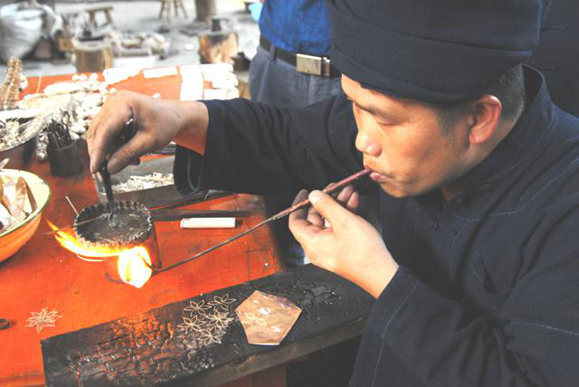 錘打:將熱銀錘打成四方形長(zhǎng)條或圓柱狀細(xì)條,再根據(jù)制作需要,做成片形或條形。