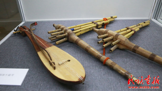 展出的侗族牛腿琴(左)、苗族六管蘆笙(中、右)