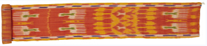 艾德萊斯綢收集于新疆庫爾勒地區(qū),大面積的紅色之中,點綴著象征維吾爾族生存環(huán)境的黃色,以及伊斯蘭教崇尚的綠色和象征著天空的藍色。木梳紋、石榴紋、龕座紋等紋樣呈條狀規(guī)則排列,多種色彩拼合出強烈的視覺效果,洋溢著跳蕩激昂的韻律和熱情似火的西域風(fēng)情。