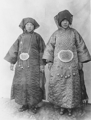 這是美國(guó)傳教士畢敬士影集中收錄的卡特·霍頓拍攝的又一張和撒拉族新娘有關(guān)的照片,此片也攝于青海循化。照片中的兩位撒拉族姑娘穿著鮮艷漂亮的衣服和翹尖的繡花鞋,佩戴著銀制的胸飾、墜子、項(xiàng)鏈、耳環(huán)和頭飾等。