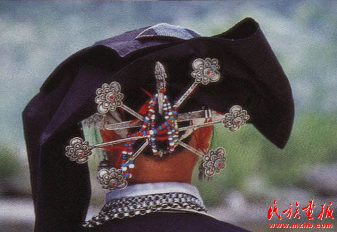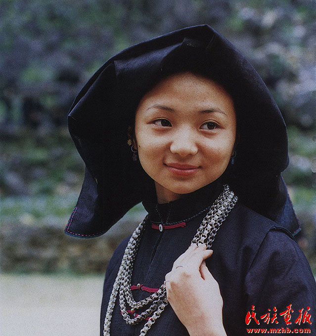 婦女的服飾更具特點,無論老少,都喜歡穿右蓋大襟和葫蘆狀矮腳圓領的緊身短式上衣,下身以寬褲腳、大褲頭的褲子相搭配,腰系黑布做成的大圍裙,頭帶黑布大頭巾。其圍裙既寬且長,戴時能系周身有余,裙底垂掛到小腿下部,圍裙不僅作為裝飾,而且可以作為勞動工具,遇趕圩或走親訪友和勞動時,可將圍裙底翻卷上來作成小包袱,用以包裝和盛裝物品。婦女頭巾都是一塊自己紡織染成的長條黑布,戴時先圍繞在頭上,然后翻折擺布成火棱形的圖樣,罩在整個頭上,再把頭巾的兩端分別垂掛到雙肩上,看上去樸素美觀。同時還可以當做帽子遮蔭用。她們的衣邊、衣角、袖口、裙邊和頭巾的四邊都用紅布或黃布剪成小條以后鑲捆上去,有的則用紅、黃、藍色絲線繡成波浪形的線條,使黑中襯出紅、黃、藍色的線條來,清雅明亮,色彩協(xié)調。再加上頭發(fā)插著龍頭形的銀簪,頸項上帶有銀鏈或項圈,手帶銀圈、玉鐲,耳掛珍珠耳環(huán)等,使人一看,黑中閃艷,樸素之中亦有玲瓏之美,表現(xiàn)了她們獨特的審美觀。