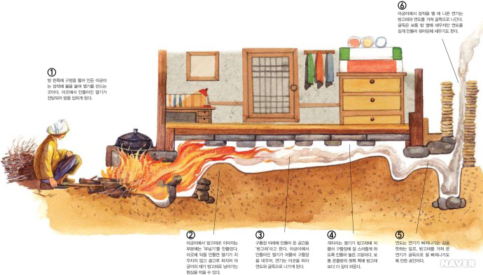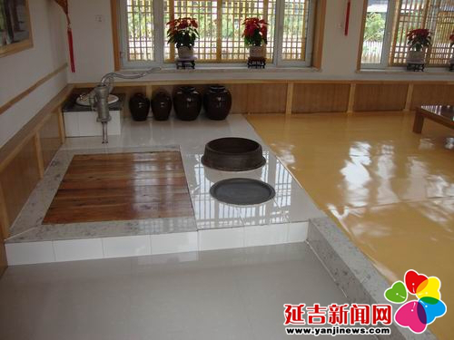在傳統(tǒng)的朝鮮族民宅中,炕和鍋臺(tái)是平齊的,需要燒火做飯時(shí),主婦會(huì)打開架在柜臺(tái)一側(cè)的移動(dòng)木板,下到地面水平線以下的“灶坑”點(diǎn)火做飯。傳統(tǒng)的炕采用長筒式結(jié)構(gòu),煙火由一洞內(nèi)循環(huán)排出,使每洞都有煙火串入,炕即溫?zé)帷3r族的火坑高度為30-40厘米,但炕洞向下挖入,炕面抹白灰,表面糊油紙或鋪草簾子,炕面平整。隨著物質(zhì)條件的改善,炕面改鋪纖維板或者地板膠,既美觀又耐用。