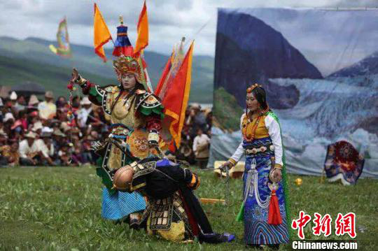 圖為掛牌儀式現(xiàn)場上演藏戲《格薩爾王傳》  鐘欣 攝