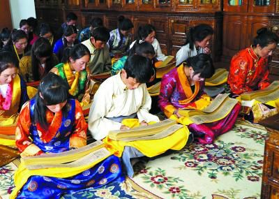 西藏藏醫(yī)學(xué)院的學(xué)生正在研讀記載著藏醫(yī)藥浴法相關(guān)知識(shí)的《四部醫(yī)典》。劉罡 攝