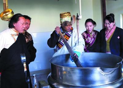 該遺產(chǎn)項(xiàng)目代表性傳承人明珠(左)指導(dǎo)瀧沐覺(jué)堪(制藥師)煎熬“五味甘露”。關(guān)確才讓 攝