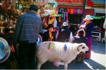 在西藏的許多寺廟及附近,常常會(huì)有單獨(dú)的、或三三兩兩的脖頸上系著紅布條沒有主人的羊只。主人把它們放生,使它們重歸自然,成為自由的羊,免去了挨宰遭殺之罪。習(xí)慣上,這些羊就叫做放生羊。轉(zhuǎn)經(jīng)人會(huì)自覺自愿給它們吃的東西,它們不會(huì)為肚子饑餓而亂躥。也許正因?yàn)槿绱耍@些放生羊才會(huì)顯得非常乖巧溫順。