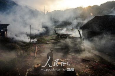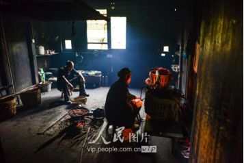 一般要到快過(guò)春節(jié)的時(shí)候,男方家才專門(mén)請(qǐng)人去接女方來(lái)洗糯米、打糍粑,新娘方能在夫家住上一夜;在來(lái)年農(nóng)忙時(shí)節(jié),又接女方來(lái)幫忙,夜里仍不能在男方家留宿,幫完忙當(dāng)晚即回去,只有待到女方有身孕后,新娘才到夫家長(zhǎng)住。圖為11月16日夜,新娘潘芝銀家為準(zhǔn)備婚禮,燈火徹夜長(zhǎng)明。