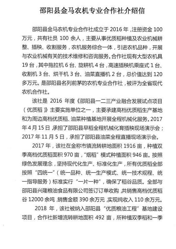 在農(nóng)機(jī)專業(yè)合作社的幫助下,當(dāng)?shù)剞r(nóng)業(yè)生產(chǎn)過程的機(jī)械化程度非常高。邵陽縣金馬農(nóng)機(jī)專業(yè)合作社,位于邵陽縣金稱市鎮(zhèn)石馬村,主要提供組織農(nóng)業(yè)機(jī)械耕整、插秧、收割服務(wù),大大提高了當(dāng)?shù)氐姆N植和生產(chǎn)效率。