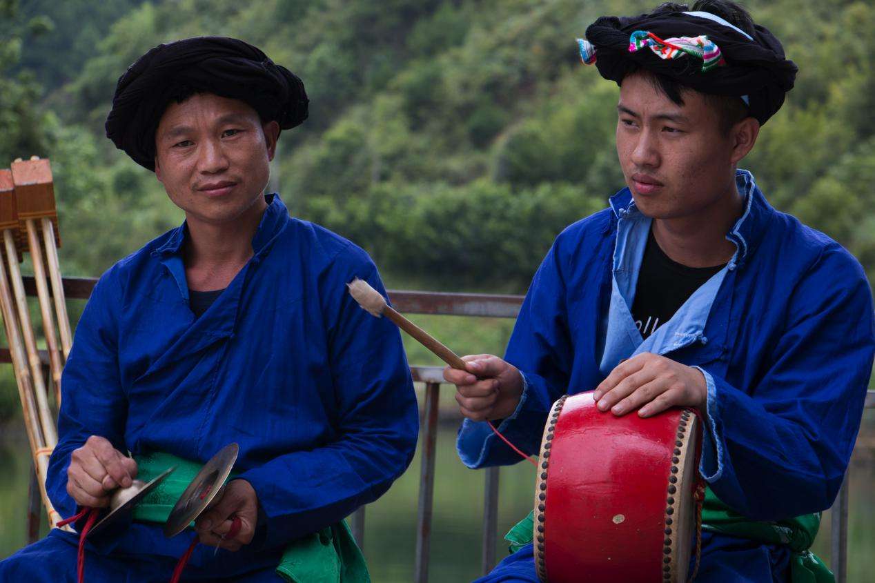 改毛村苗族村民的傳統(tǒng)服飾至今保留完好,而且現(xiàn)在村內(nèi)的苗族人都還有穿著本民族傳統(tǒng)服飾的習(xí)慣。改毛村的苗族男性一般頭戴黑色絲帕裹成的帽子,絲帕里裹有彩色絲巾。穿著藍(lán)色打底的斜襟長(zhǎng)衫,腰部系有綠色腰帶。