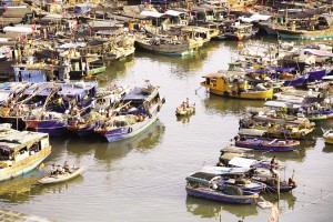 小快船靠上捕魚歸來的大漁船,收購、轉(zhuǎn)運(yùn)海鮮漁獲(2014年攝)。