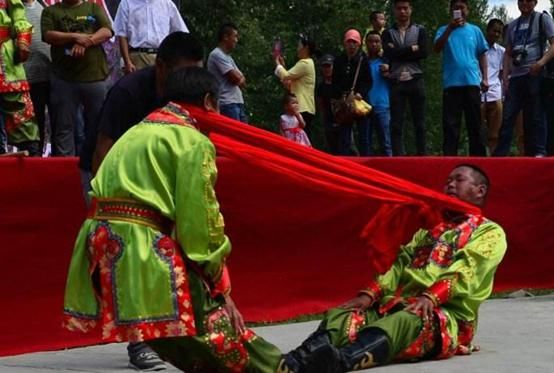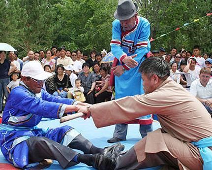 頸力賽和扳棍一樣,也是達(dá)斡爾族傳統(tǒng)的競技項(xiàng)目之一,在達(dá)斡爾族之間十分流行。頸力賽的比賽方式和扳棍相似,比賽雙方需要端坐在平地上,蹬直雙腿,腳掌相對,雙手叉腰或放在腿上,用布腰帶套在雙方脖頸后部。當(dāng)裁判員聲響后,比賽雙方需要互相用脖頸力拉扯對方,哪一方被拉起或屈膝歪倒,就輸?shù)袅吮荣悺?/p>