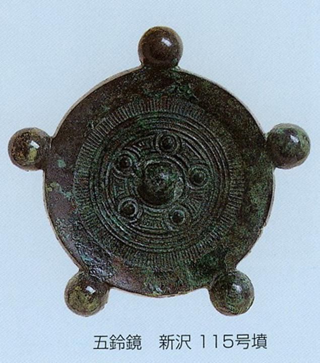 銅鏡在古墳時代被視為珍貴而神奇的器物一方面從中國輸入,另一方面也有就地制造。奈良縣出土的大型仿制連弧紋鏡和五鈴鏡(圖十四),就是日本特有的銅鏡類型。