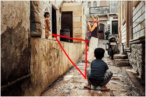 上面這張照片是西方游客在給印度小女孩拍照,這也是一個(gè)街拍照片,我其實(shí)比較喜歡這張照片,我同時(shí)拍了好幾張。如果畫面中沒有前面蹲著的這個(gè)小男孩作為襯托,整個(gè)畫面就削弱了許多,畫面就沒有那么生動。