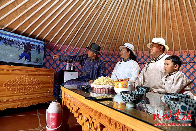 邊境牧區(qū)無(wú)線(xiàn)網(wǎng)絡(luò)暢通,阿巴嘎旗牧民伊拉勒?qǐng)D一家在觀(guān)看直播節(jié)目。