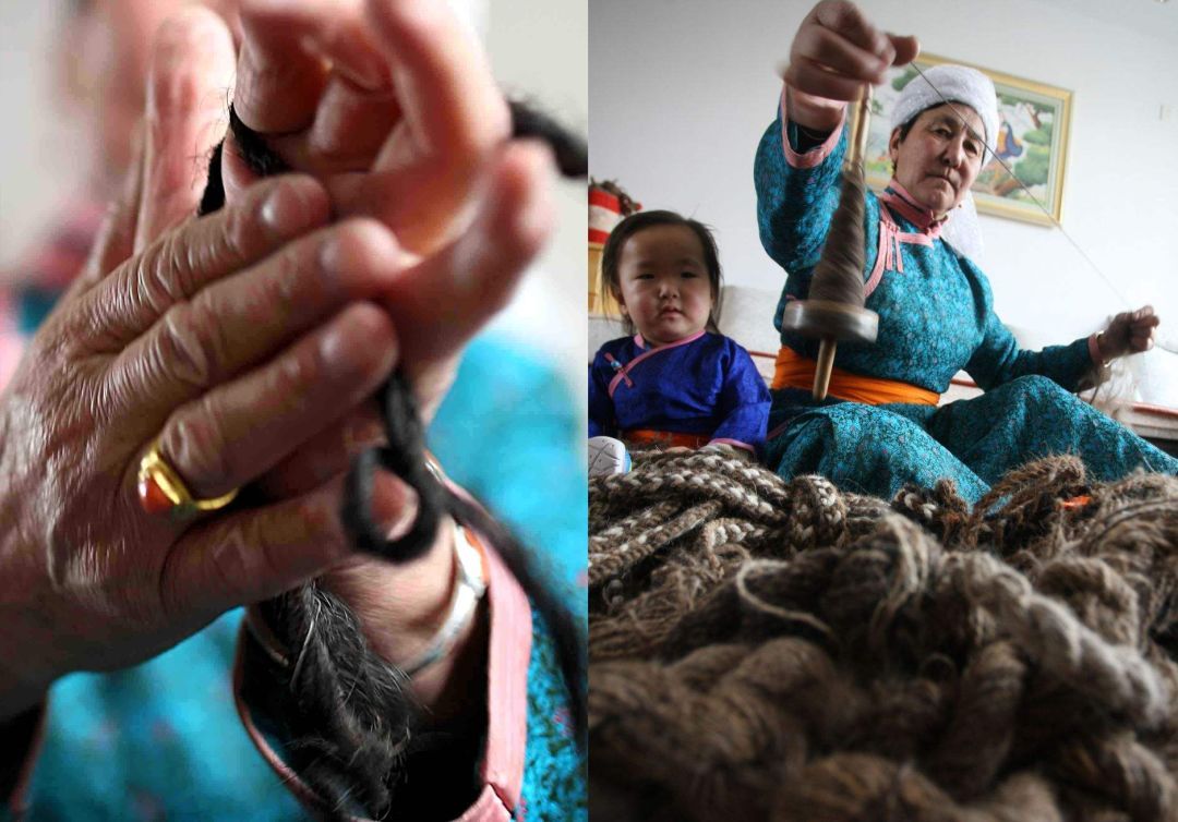 傳統(tǒng)氈繡不僅用于工藝品,大多用在生產(chǎn)生活中。蘇尼特氈繡技藝的繡制首先從制氈開始,大都在夏末秋初進(jìn)行。材料多為駝絨線,而紡駝絨線則是用駱駝膝蓋絨毛以及駝鬣的細(xì)絨手搓而成。