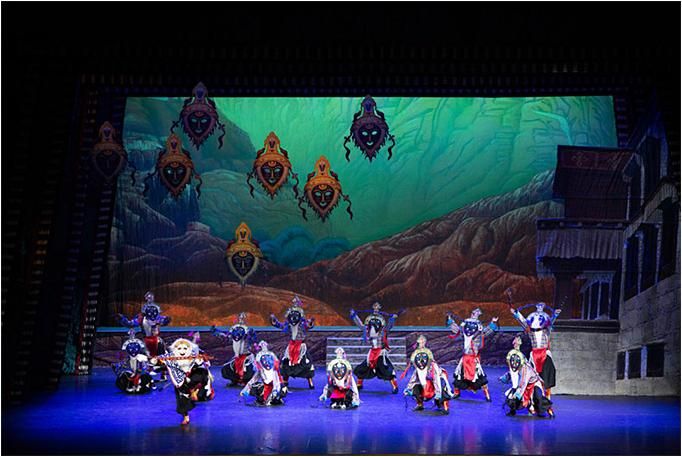 在手段創(chuàng)新上,主創(chuàng)人員在嚴(yán)格遵循南木特藏戲藝術(shù)傳統(tǒng)和戲劇原則的基礎(chǔ)上,設(shè)計(jì)了部分新的唱腔,使用了現(xiàn)代舞臺(tái)的舞美和聲光電手段,采用了26人組成的中型民族樂隊(duì),從而營(yíng)造出了全新的舞臺(tái)效果。在藝術(shù)手法上,還采用了以南木特藏戲手段表現(xiàn)西藏藏戲內(nèi)容的特殊表現(xiàn)形式,以戲中戲的重疊盡顯不同風(fēng)格的藏戲風(fēng)采,大大地豐富了表演手段和出彩看點(diǎn),為觀眾提供了巨大的想象空間。